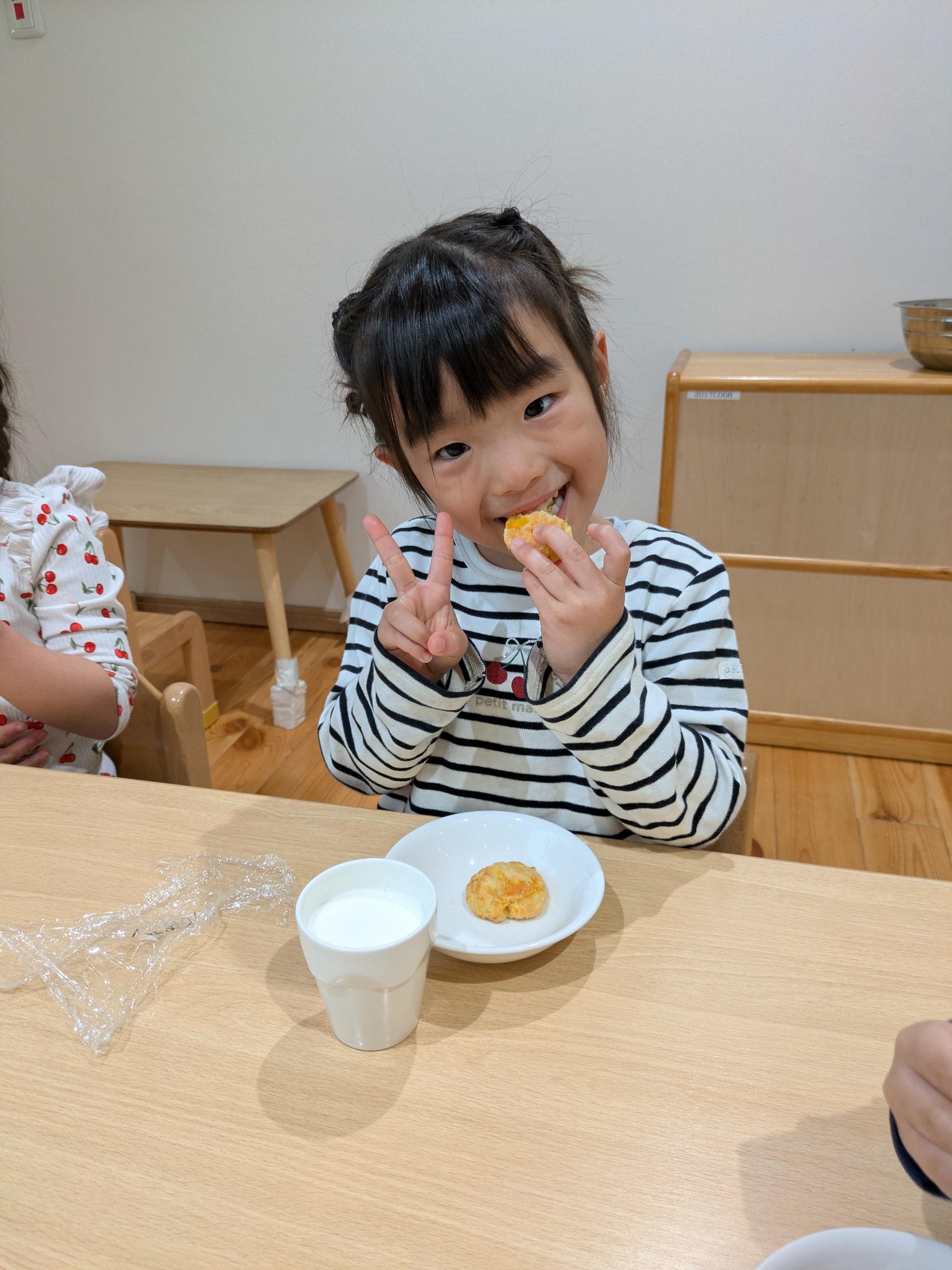 おやつの時間に自分で作ったクッキーを食べました!かじりつつ、「ここににんじんあった!」とクッキーの中のにんじんを見つけて喜んでいました😊